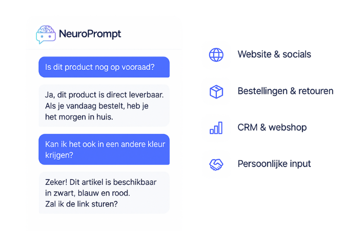 Dankzij de slimme AI-technologie is Neuroprompt dag en nacht beschikbaar om klanten direct te helpen. Hierdoor kunnen er veel meer interacties tegelijk worden verwerkt zonder wachttijd, terwijl de druk op je team merkbaar lager wordt.